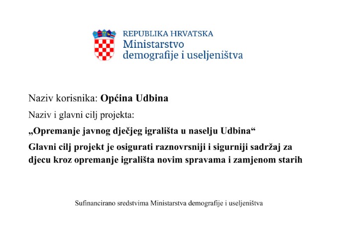 Kroz program 'Dostupnost kvalitetnih i priuštivih sadržaja za djecu u lokalnim zajednicama kroz opremanje i uređenje igrališta za djecu' čiji poziv za dodjelu bespovratnih sredstava je objavilo Ministarstva demografije i useljeništva, opremili smo postojeće dječje igralište u Udbini. Opremanje je uključivalo instaliranje pet novih sprava od čega smo tri postavili na novim lokacijama, a zamjenili dvije dotrajale. Osim toga instalirano je dodatnih 35 m2 antistres podloge za sigurnije okruženje, zamijenjene su dvije dotrajale sjedalice na postojećim ljuljačkama, postavljene su četiri kante za smeće u cilju lakšeg očuvanja okoliša te je instalirana informativna ploča. Ukupna vrijednost opreme i radova iznosila je 26.375,50 eura od čega je glavninu sufinaciralo Ministarstva demografije i useljeništva u iznosu od 25.840,00 eura.
